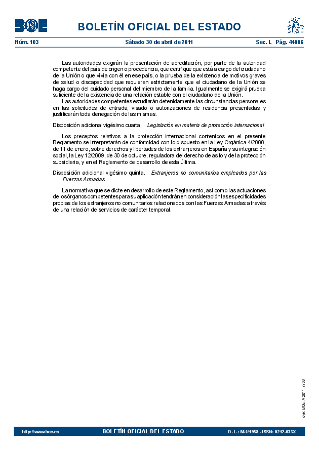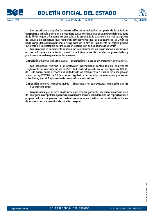 Reglamento de la Ley de Extranjeria BOE de 30-04-2011
