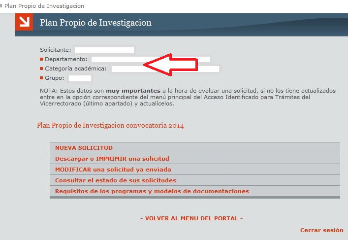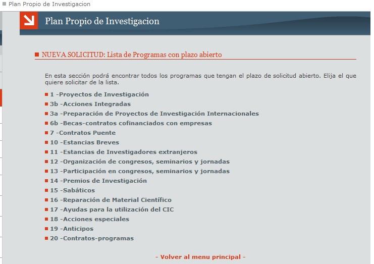 ACCESO DE USUARIOS. Una vez que usted tiene un Nombre de Usuario y una Contraseña asociada, puede acceder al menú de usuarios introduciéndolos en la página de la sección de Trámites del Vicerrectorado. Verá el menú principal y sus distintas opciones, deberá escoger Plan Propio de Investigación.